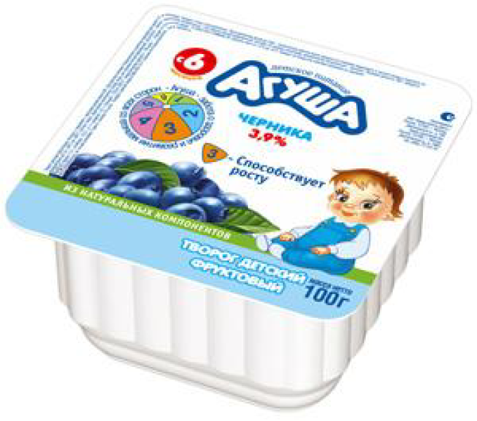 Творог «Агуша» черника 3,9%, 100 г предназначен для детей от 6 месяцев. Кисломолочный продукт богат витамином К2, который участвует в развитии и оформлении костной системы, зубов, усвоении организмом кальция. Источник белка дополнен ягодным наполнителем с черничным вкусом, а консерванты, ГМО и красители в составе отсутствуют. Фруктовый творог с массовой долей жира 3,9% употребляется в качестве прикорма для детей. В закрытой упаковке продукт хранится в холодильнике 21 день, а при вскрытии — дальнейшему хранению не подлежит. Пластиковый стаканчик удобен для транспортировки и использования, поэтому творожок можно брать с собой в поездки или на прогулку с малышом. Приобрести творог «Агуша» черника 3,9%, 100 г можно в Москве в торговом центре METRO.Бренд: «Агуша». Производитель: ОАО «Вимм Билль Данн».Страна: Россия.Вид: творог мягкий.Вкус: черника.Пищевая ценность (на 100 г продукта): белки — 7,4 г, жиры — 3,9 г, углеводы — 10,2 г, сахароза — 6,7 г, кальций — 88 мг, витамин К2 — 2,2 мкг.Энергетическая ценность (на 100 г продукта): 106 ккал/444 кДж.Состав: творог (молоко нормализованное, закваска), фруктовый наполнитель черника (сахар, концентрированный сок из черники, вода, загуститель – пектин, ароматизатор натуральный — черника, регулятор кислотности – цитрат натрия, концентрированный сок из красной свеклы (в качестве красящего вещества), концентрированный сок из черной моркови (в качестве красящего вещества.Способ употребления: перед кормлением детей до года, назначенную врачом массу продукта из упаковки переложить в чистую посуду, предназначенную для кормления ребенка, подогреть на водяной бане до температуры от 36 до 38°С.Условия хранения: хранить при температуре от 2 до 6°С. Продукт во вскрытой упаковке хранению не подлежит.Объем: 100 мл.Возраст: с 6 месяцев.Упаковка: пластиковый стаканчик.Размер упаковки: 72х144х43 мм.Стандарт качества: ТУ 9222-010-17096582-04.