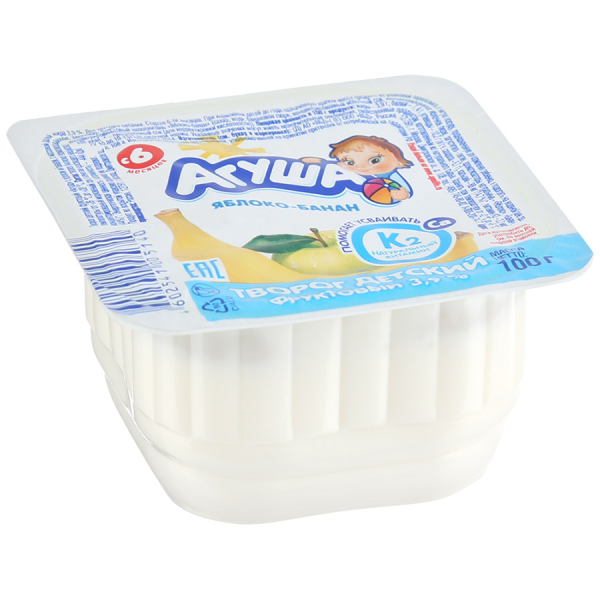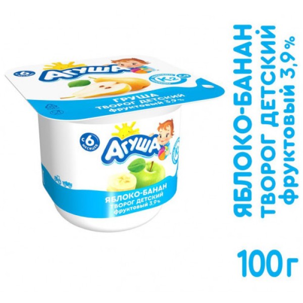 Творог АГУША Яблоко/банан, 3,9% 100г имеет нежный сливочно-фруктовый вкус и однородную консистенцию. Подходит для прикорма, начиная с шести месяцев. Продукт производят из натуральных ингредиентов, которые сохраняют витамины и минералы, чтобы малыш всегда оставался жизнерадостным и игривым. В его составе пюре банана и яблока, сок моркови. Пластиковая упаковка позволяет сохранять свежесть и вкусовые качества творожка.Творог АГУША Яблоко/банан, 3,9% 100г станет любимым лакомством любого малыша. Приобрести его можно по привлекательной цене в торговом центре METRO Cash & Carry.Состав: творог, фруктовый наполнитель (сахар, вода, пюре яблока, пюре банана, загуститель - пектин, краситель натуральный - сок моркови концентрированный, натуральные ароматизаторы - яблоко, банан, регулятор кислотности - концентрированный лимонный сок).Энергетическая ценность 105 ккал, жир - 3,9г, белок - 7,3г, углеводы - 10,2 в т.ч. сахарозы - 6,7г, кальций 120мг.Условия хранения: хранить при температуре от +2'C до +6'C и относительной влажности не более 75%.Годен в течение: 14 суток.