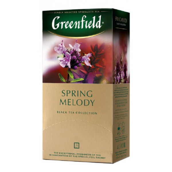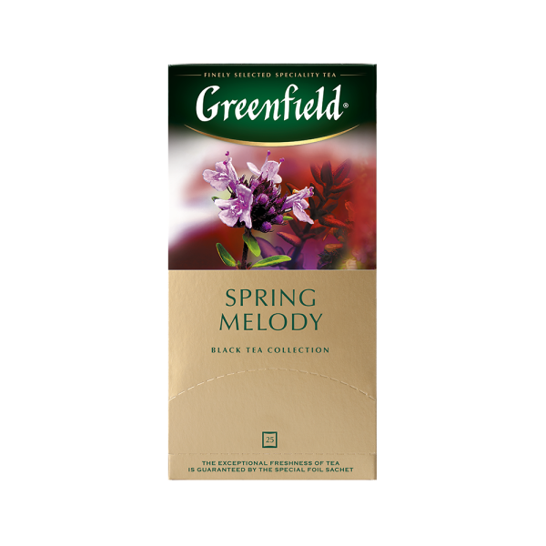 Описание и характеристики ООО "Орими" Чай Гринфилд Спринг Мелоди. Индийский чай черный байховый с душистыми травами и фруктовым ароматом в пакетиках для розовой заварки. Приятная терпкость, присущая дорогим сортам индийского чая, пряный оттенок чабреца и прохладная мятная нотка создают неповторимый букет Гринфилд Спринг Мелоди- лёгкий, яркий и свежий, как дыхание весны. Хорошо утоляет жажду. Индийский чай чёрный байховый с душистыми травами и фруктовым ароматом в пакетиках для разовой заварки. Состав: чай черный байховый, ароматизатор, лист черной смородины ,мята, чабрец. Способ приготовления: положить в заварочный чайник или чашку по одному пакетику на человека. Залить кипятком, дать настояться 5-7 минут. Хранить в сухом без посторонних запахов месте с относительной влажностью воздуха не выше 70%. Срок годности 2 года. ТУ 9191-004-46951679-04