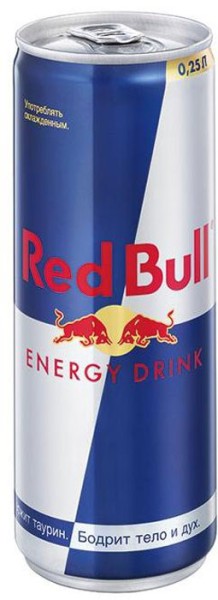 Энергетический напиток Red Bull повышает работоспособность, увеличивает концентрацию внимания и скорость реакции, повышает бдительность, улучшает эмоциональное настроение, стимулирует обмен веществ.Не рекомендуется употребление детьми в возрасте до 18 лет, при беременности и кормлении грудью, а также лицам, страдающим повышенной нервной возбудимостью, бессонницей, артериальной гипертензией.Состав: газированная вода, сахароза, глюкоза, регуляторы кислотности (лимонная кислота, гидрокарбонат натрия, карбонат магния), таурин (400 мг/100 мл), натуральный кофеин (32 мг/100 мл), витамины (ниацин, пантотеновая кислота, В6, В12), ароматизаторы, красители (сахарный колер простой, рибофлавин).Пищевая ценность(на 100 мл): энергетическая ценность (калорийность) –46 кКал (194 кДж), белки –0 г, углеводы –11 г, жиры –0 г; витамины: ниацин – 8 мг, пантотеновая кислота –2 мг, В6 –2 мг, В12 –2 мкг.Рекомендованное суточное потребление: не более одной банки.Хранить при температуре от 0 до 25 С.Употребить сразу после вскрытия банки.Дата изготовления, срок годности и номер партии указаны на дне банки.Срок годности: 2 года. Имеются противопоказания, подробнее см.на упаковке товара.