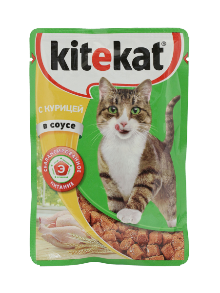 Корм влажный для кошек KITEKAT с сочными кусочками курицы в соусе, 85 г разработан для полноценного питания животных любого возраста. Лакомство на основе мяса имеет привлекательный для питомцев вкус, полностью сбалансировано необходимыми полезными веществами, дополнено витаминами и микроэлементами. Корм подходит для животных всех пород, поддерживая здоровье. Он представлен в компактной герметичной упаковке, не занимающей много места при хранении. Для взрослой кошки весом около 4 кг рекомендуется 3-4 пакета корма в день, которые нужно разделить на как минимум на два приема. При этом необходимо следить, чтобы чистая питьевая вода всегда оставалась в свободном доступе у животного. Приобрести корм влажный для кошек KITEKAT с сочными кусочками курицы в соусе, 85 г можно в Москве в торговом центре METRO.Состав: мясо и субпродукты (в том числе курица минимум 10%), злаки, таурин, витамины, минеральные вещества.Пищевая ценность в 100 г продукта: белки - 6 г; жиры - 3,5 г; зола - 2,5 г; клечатка - 0,3 г; витамин А - не менее 150 МЕ; витамин Е - не менее 0,9 мг; влага - 84 г.Условия хранения: хранить при температуре от +4 до +35?C и относительной влажности воздуха не более 75%.Рекомендуемая дневная норма потребления: кошки до 4 кг - 400 г, беременная - 600 г, кормящая - 800 г.Страна-производитель: Россия.
