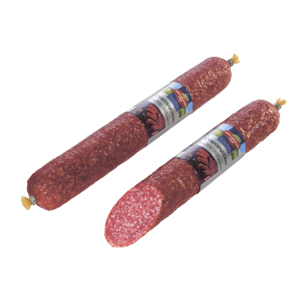 Состав: куриное филе, шпик, нитритная соль (поваренная соль, фиксатор окраски нитрит натрия), вода, глюкоза,пшеничная клетчатка,пряности,стабилизатор (Е450), антиокислители (аскорбат натрия, аскорбиновая кислота), экстракты пряностей,порошок гемоглобина, краситель (кармин), носитель ( Е 551), растительное масло, стартовая культура. Пищевая и энергетическая ценность: В 100 г продукта белок 18 г жир 45 г калорийность 490 ккал Условия хранения: После вскрытия упаковки употребить в течении 120 суток в пределах срока годности.