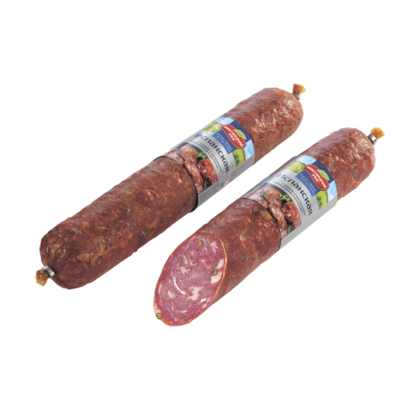Состав: свинина, нитритная соль (поваренная соль, фиксатор окраски нитрит натрия), глюкоза, усилители вкуса и аромата (глутамат натрия, рибонуклеотид кальция), ароматизаторы("мясной", "дрожжевой"), антиокислители( аскорбат натрия ,аскорбиновая кислота, лимонная кислот), экстракты пряностей (черный перец, мускатный орех),пряности (черный перец, мускат,чеснок), сахар, аромат дыма, перец зеленый горошек,стартовые культуры.