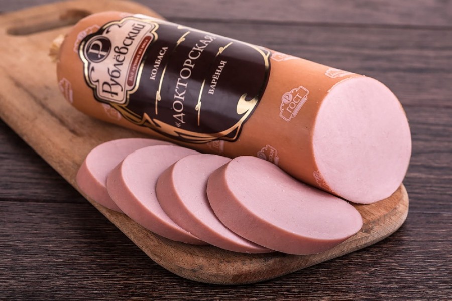 Свинина, говядина, вода, соль, молоко сухое, яичный порошок,сахар, смесь специй, мускатный орех, антиокислитель аскорбиновая кислота, фиксатор окраски нитрит натрия. Возможно незначительное содержание сельдерея, горчицы, кунжута.