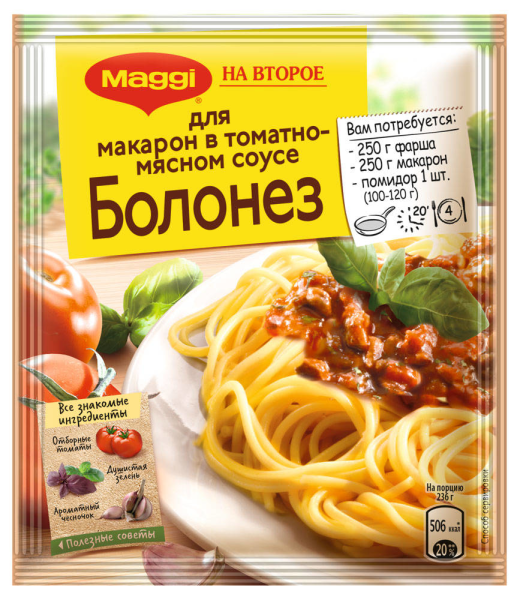 МАГГИ НА ВТОРОЕ для макарон в томатно-мясном соусе Болонез 30 г. Макароны — неотъемлемая часть итальянской кухни. Существует множество рецептов приготовления пасты — с фаршем, с мясом, с овощами, с морепродуктами, со всевозможными специями и соусами. А одно из самых любимых итальянцами блюд — спагетти Болонез. Чтобы у вас получилось настоящая итальянская паста, приготовьте макароны с MAGGI® На второе. Тщательно подобранная композиция натуральных овощей, ароматных трав и пряных специй и пошаговая инструция помогут вам приготовить гарантировано вкусное блюдо для всей семьи.Вы можете купить МАГГИ НА ВТОРОЕ для макарон в томатно-мясном соусе Болонез 30 г в торговом центре METRO.Тип: кулинария.Состав: Сушеные овощи (томат (порошок) (44%), чеснок (порошок), лук)пшеничная мука (содержит глютен), йодированная соль (соль, йодат калия), сахар, сушеные пряные травы (базилик, сельдерей, орегано, петрушка), подсолнечное масло, специи молотые (перец черный, карри). Продукт может содержать молоко.Бренд: MAGGI.Название производителя: ООО "Нестле Россия".Вес нетто: 0.03 кг.Тип упаковки: пакет прямоугольный.БЖУ: 9/3.2/58.Энергентическая ценность: 314ккал/1328кДж.Условия хранения: до 25 C°.Срок годности: 360 дней.