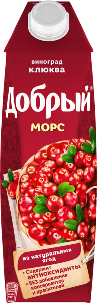 Морс Добрый Клюква-Виноград 1л. Морс из винограда и клюквы "Клюква". Для питания детей с 3-х лет. Минимальная объемная доля сока и пюре 15%. Состав: виноградный сок, пюре из клюквы, сахар, регуляторы кислотности - лимонная кислота; натуральные ароматизаторы, очищенная артезианская вода. Изготовлен из концентрированного сока. Пищевая ценность на 100мл: углеводы - 10,8г. Энергетическая ценность: 43 ккал(183Дж). Без добавления консервантов и красителей. Содержит антиоксиданты. Хранить при температуре от 0 до 25'С. Срок годности 12 месяцев.