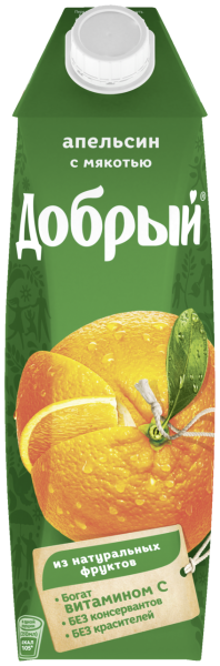 Нектар ДОБРЫЙ Апельсин, 1 л – вкусный и полезный освежающий напиток. Изготовленный из спелых апельсинов продукт подарит энергию солнца и заботу самой природы. Благодаря специальной технологии напиток сохраняет натуральный неповторимый запах и вкус фруктов. Его подают охлажденным, также можно использовать для приготовления различных коктейлей и десертов.Асептическая упаковка надолго сохраняет свежесть продукта и удобна в использовании. Напиток изготовлен из натурального апельсинового сока, богат углеводами и витаминами. Купить нектар ДОБРЫЙ Апельсин, 1 л можно в Москве в торговом центре METRO.Производитель: иностранное частное предприятие Вланпак, Республика Беларусь, Минская обл., г. Смолевичи, ул. Вокзальная, 5Б.Состав: вода, концентрированный апельсиновый сок, сахар, регулятор кислотности лимонная кислота.Пищевая ценность в 100 г: белки – 0,2 г, жиры – 0,1 г, углеводы – 11,3 г.Энергетическая ценность в 100 г: 48 ккал.Срок хранения: 12 месяцев.Условия хранения: при температуре от 0°С до + 25°С и относительной влажности воздуха не более 75%.СТБ 1449.
