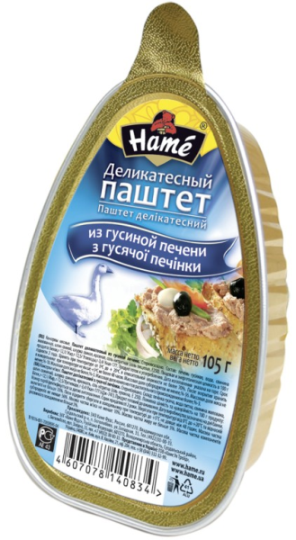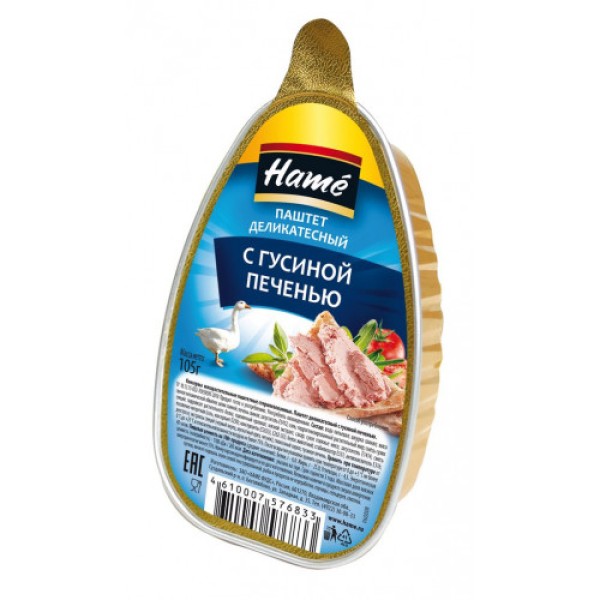 Паштет HAME деликатесный из гусиной печени, 105 г изготовлен на основе натуральных компонентов и содержит более 70% мясных ингредиентов. Продукт отличается низкой калорийностью и имеет исключительно мягкий насыщенный вкус, а также нежную кремовую консистенцию. Паштет из гусиной печени – удачный выбор для бутербродов, закусок и прочих блюд. Он подойдет для быстрого обеда в офисе или в дороге, а фольгированная упаковка имеет оптимальный размер, который удобен для употребления продукта в течение 2 суток после вскрытия. Купить паштет HAME деликатесный из гусиной печени, 105 г можно в Москве в торговом центре METRO.Производитель:ЗАОХаме Фудс, Россия.Состав: печень гусиная, вода, свинина жилованная, шпик свиной, шкурка свиная, соль посолочно-нитритная (соль пищевая, консервант Е250), крахмал кукурузный модифицированный, специи.Пищевая ценность: белки – 12,1 г, жиры – 12,5 г, углеводы – 3,4 г.Энергетическая ценность: 177 ккал.Срок годности: 3 года.Условия хранения:при температуре от 0°С до 20°С.ГОСТ ТУ 9216-001-70959595-04.