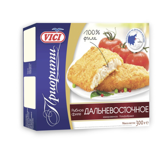 Рыбное филе VICI Дальневосточное, 300 г – вкусный и сытный обед, который готовится за считанные минуты. Достаточно просто обжарить ароматные кусочки филе минтая в хрустящей панировке – и можно подавать на стол. Кусочки сочетаются с разными соусами, кетчупом и подходят к различным гарнирам – гречке, макаронам, овощам и картофелю. Продукт изготовлен из отборного минтая и содержит большое количество витаминов и микроэлементов. Рыба известна высоким содержанием омега-3 жирных кислот, а также фолиевой кислоты, которые благотворно воздействую на кровеносную систему, нормализуют обмен веществ. Купить рыбное филе VICI Дальневосточное, 300 г вы можете в Москве в торговом центре METRO.Производитель: ООО "Вичюнай Русь", Россия.Состав: филе минтая,панировка (сухари панировочные (мука пшеничная, дрожжи, соль, специи, экстракт специй (содержит: эмульгатор Е472е, антиоксидант Е307) ), вода, масло рапсовое , мука пшеничная , крахмал пшеничный, белок яичный, петрушка, соль)).Пищевая ценность: белки – 12,7 г, жиры – 6,9 г, углеводы – 14,4 г.Энергетическая ценность: 170 ккал.Срок годности: 12 месяцев.Условия хранения: при температуре не выше -18°С.ГОСТ ТУ 9266-002-51813165.