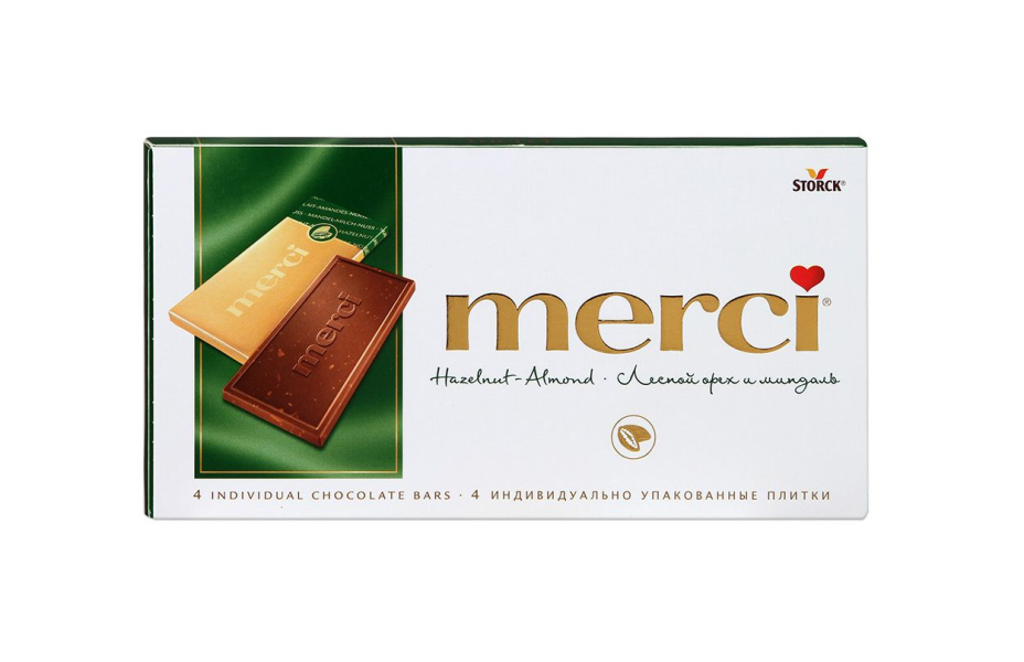 Шоколадные плитки MERCI – это шоколад высочайшего немецкого качества и потрясающего вкуса. Оригинальная упаковка в виде конверта содержит четыре изящных индивидуально упакованных плиточки шоколада.Производитель: AUGUST STORCK KG (АВГУСТ ШТОРК КГ), Германия, Берлин, D-13403, Вальдштрассе, 27.Состав: сахар, молоко сухое цельное, какао-масло, кусочки лесных орехов, какао тертое, кусочки миндаля, пахта сухая (сывороточный продукт), лактоза, эмульгатор соевый лецитин, экстракт ванили. Содержание общего сухого остатка какао - не менее 32%, массовая доля сухого обезжиренного остатка какао – не менее 3%, массовая доля сухого общего остатка молока - не менее 18%, массовая доля молочного жира – не менее 5%. Продукт может также содержать частицы арахиса и прочих орехов.Пищевая ценность на 100 г: белки – 9,8г, жиры – 37,4 г, углеводы – 47,0 гЭнергетическая ценность: 2374 кДж/570 ккалСрок годности: 240 днейУсловия хранения: Хранить в сухом прохладном месте при температуре от 13'С до 21'С иотносительной влажности воздуха от 40% до 65%.Декларация о соответствии: EAЭC N RU Д – DE.MГ11.В.09737