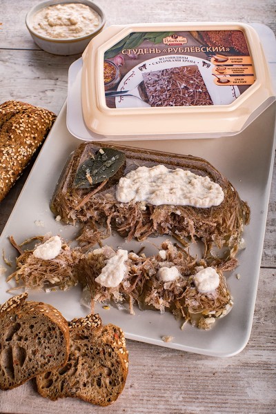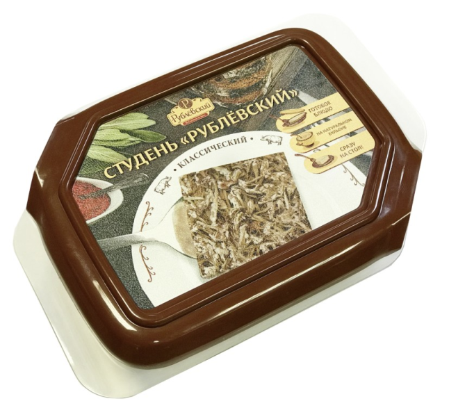 Студень РУБЛЕВСКИЙ Классический, 380 г относится к классическому европейскому меню. Это мясной продукт, полученный из свиного филе и нескольких типов субпродуктов, обволакиваемых насыщенным бульоном. Нежный вкус мяса оттеняется специями и пряностями. Студень готов к подаче на стол, достаточно освободить его из упаковки и нарезать порционными кусками. Можно использовать его в качестве закуски или полноценного второго блюда. Приобрести студень РУБЛЕВСКИЙ Классический, 380 г можно в Москве в торговом центре METRO.Тип продукта: студень.Тип мяса: свинина.Вес: 380 г.Упаковка: пластиковая пачка.Состав: бульон мясной жидкий (содержит воду), свинина, мясо голов свиных, желатин пищевой, чеснок, соль, поваренная пищевая, пряности, экстракты пряностей, регулятор кислотности (ацетат натрия), влагоудерживающий агент (лактат натрия), усилитель вкуса и аромата (глутамат натрия).Возможно незначительное содержание молочных и яичных продуктов, глютена, орехов.Пищевая и энергетическая ценность в 100 г продукта: белок — 8 г, жир — 15 г, калорийность 167 ккал/699 кДж.Хранить при температуре от 0°С до +6°С и относительной влажности воздуха 75-78%.После вскрытия упаковки хранить при температуре от 0°С до +6°С не более 24 часов.Срок годности 45 суток.Бренд: Рублевский МК.Страна производства: Россия.ТУ 10.13.14-014.56628803-2017