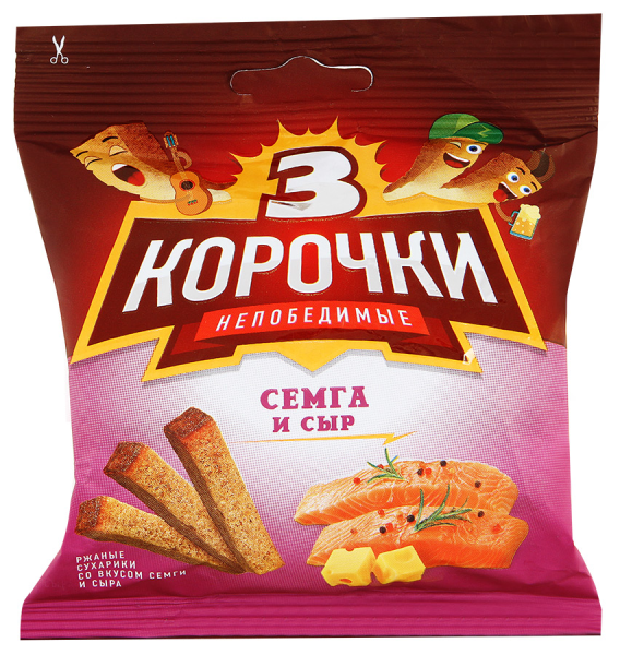 Сухарики ТРИ КОРОЧКИ Семга с сыром производятся из свежеиспеченного хлеба высокого качества, полученного посредством использования двух видов муки. Снек изготовлен при помощи специального метода, исключающего обжаривание во фритюре, благодаря чему продукт сохраняет полезные витамины и минералы злаковых культур. Внутри упаковки имеется ароматный соус тартар, который хорошо гармонирует с хлебцами.Сухарики незаменимы для быстрого перекуса во время различных путешествий, так как надолго устраняют чувство голода и обеспечивают организм дополнительными силами и энергией. Компактная упаковка занимает мало места в сумке и имеет небольшой вес. Хлебцы можно использовать во время приготовления мясных и рыбных салатов или в качестве дополнения к супам-пюре, бульонам и прохладительным напиткам. Купить сухарики ТРИ КОРОЧКИ Семга с сыром вы можете в Москве в торговом центре METRO.Производитель: «КДВ групп», Россия.Состав: хлеб из смеси ржаной и пшеничной муки, растительное масло, ароматизатор «Семга с сыром», соль, сахар-песок, усилители вкуса и аромата, растительный белок гидролизованный, натуральные вкусоароматические вещества, вкусоароматические вещества, креветка порошок, рыбный порошок, регуляторы кислотности, краситель экстракт паприки, растительный жир, антислеживающий агент. В составе ароматизатора возможно присутствие следов молока, сельдерея, горчицы и сои.Пищевая ценность: белки — 11 г, жиры — 8,7 г, углеводы — 70 г.Энергетическая ценность: 430 ккал.Срок годности: 5 месяцев.