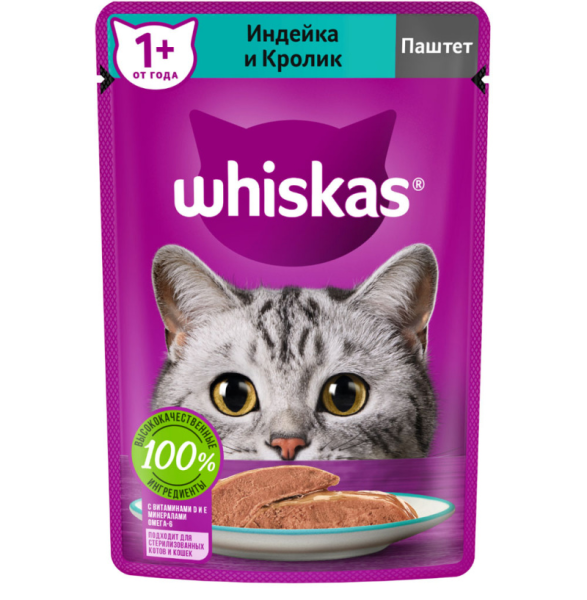 Вискас Пауч д/взр.кошек Паштет индейка и кролик 75г